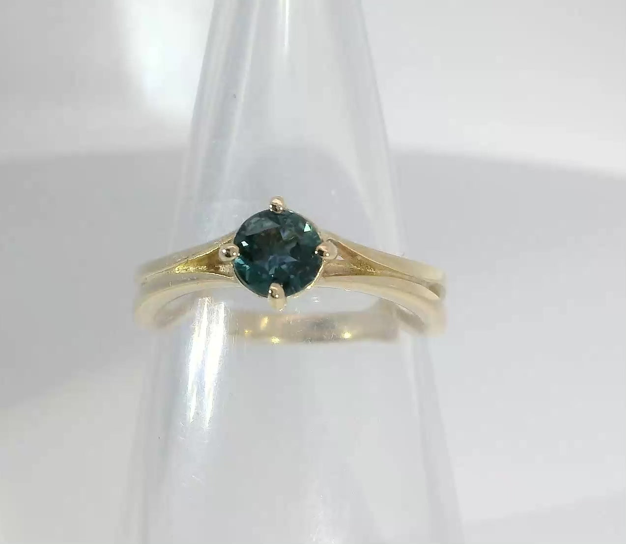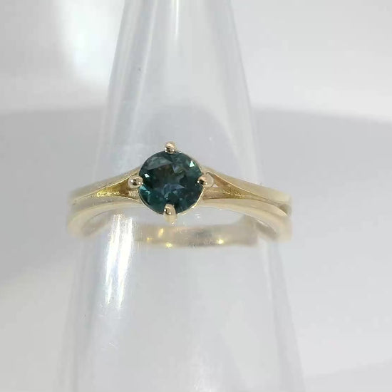 This yellow gold solitaire ring is set with a blue sapphire, making it an elegant choice suitable for everyday wear.