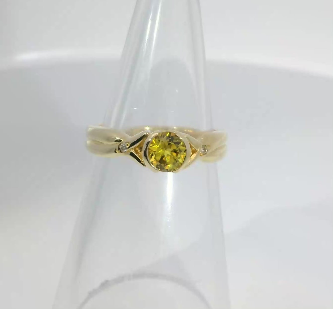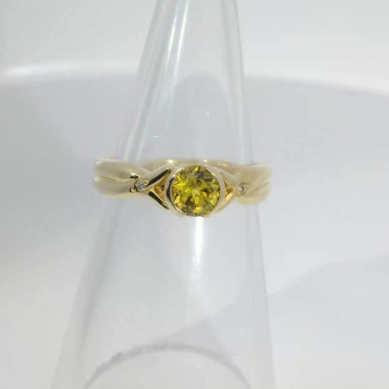Discover the beauty of this elegant yellow gold ring, featuring a stunning round yellow sapphire at its centre. The intricate ring design showcases a delicate twist with a diamond set either side. Perfect for special occasions or as a thoughtful gift, this ring is a timeless addition to your Jewellery collection.