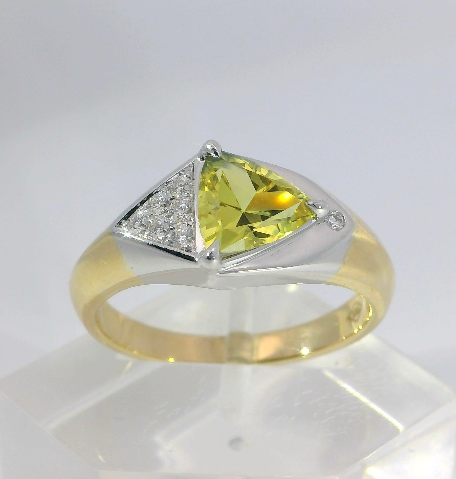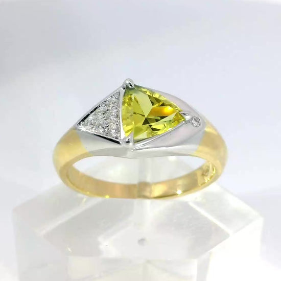 This ring, meticulously crafted in radiant yellow and white gold, showcases a trilliant-cut yellow sapphire accentuated by complementary diamonds. Its distinctive design offers a harmonious blend of modern sophistication and enduring elegance.