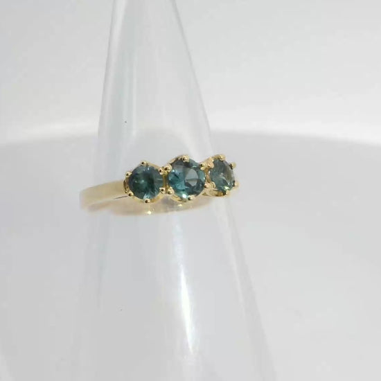 This 18-carat gold ring showcases a slender band set with three striking teal sapphires. The gems’ distinctive hue lends an elegant flair, making this ring an ideal choice for any event. Whether you wear it solo or pair it with other rings, it is certain to attract attention.