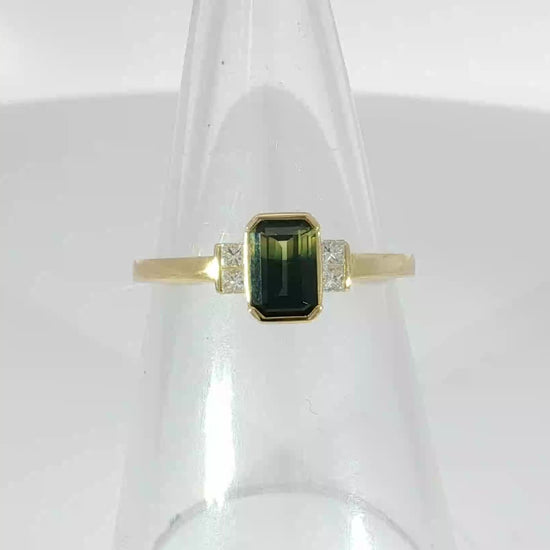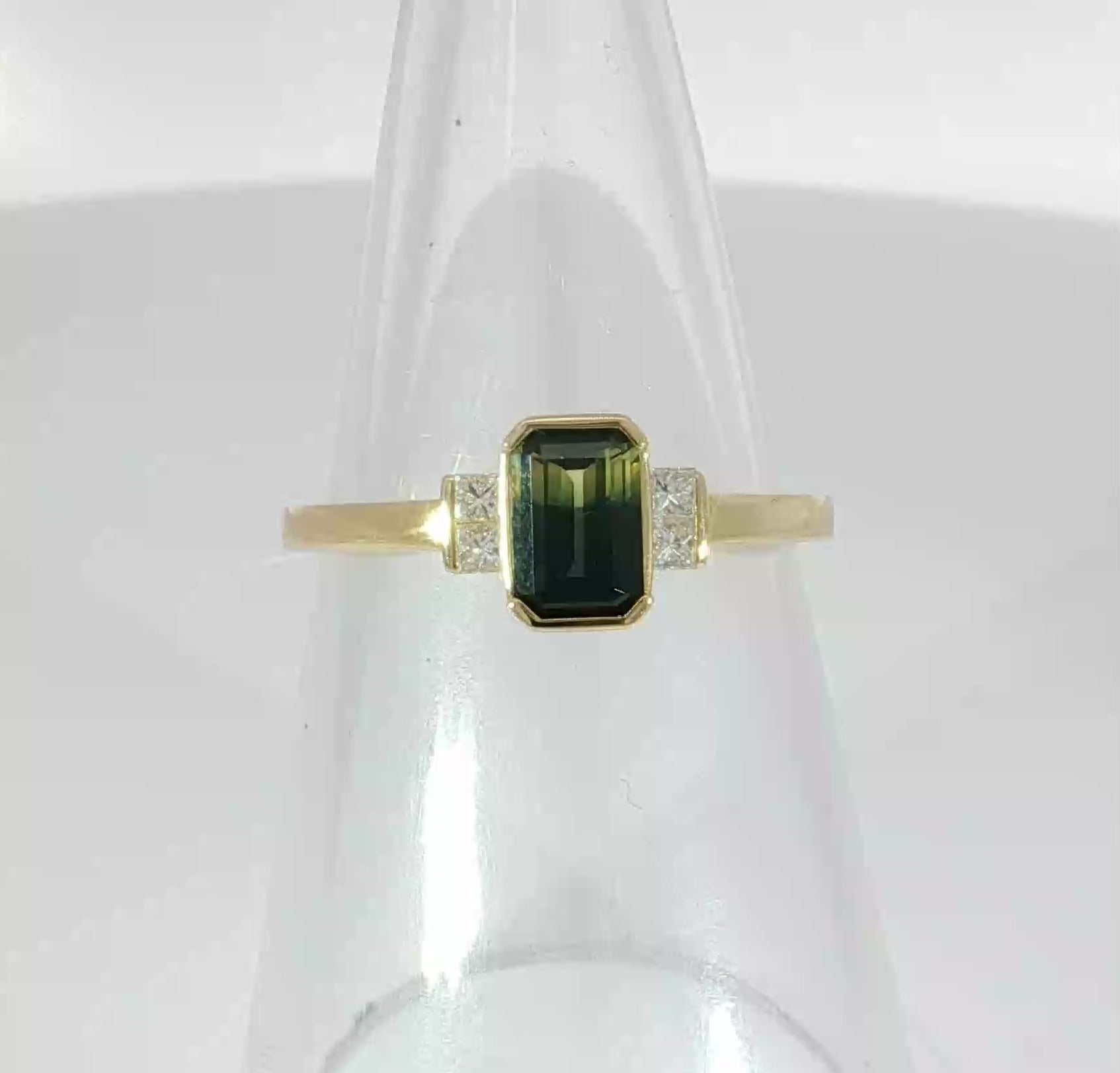 This ring showcases a blue-yellow colour split sapphire, set in 18ct yellow gold with diamonds on each side for added brilliance.