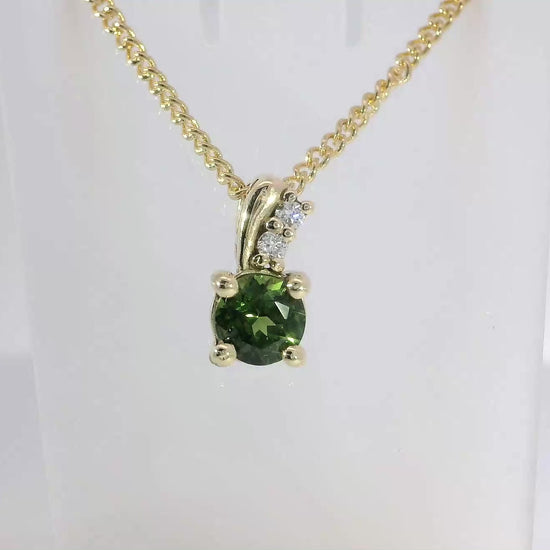 Enhance your collection with this 9ct yellow gold pendant. Showcasing a round brilliant-cut sapphire accompanied by two diamonds, the piece presents a striking green hue.
